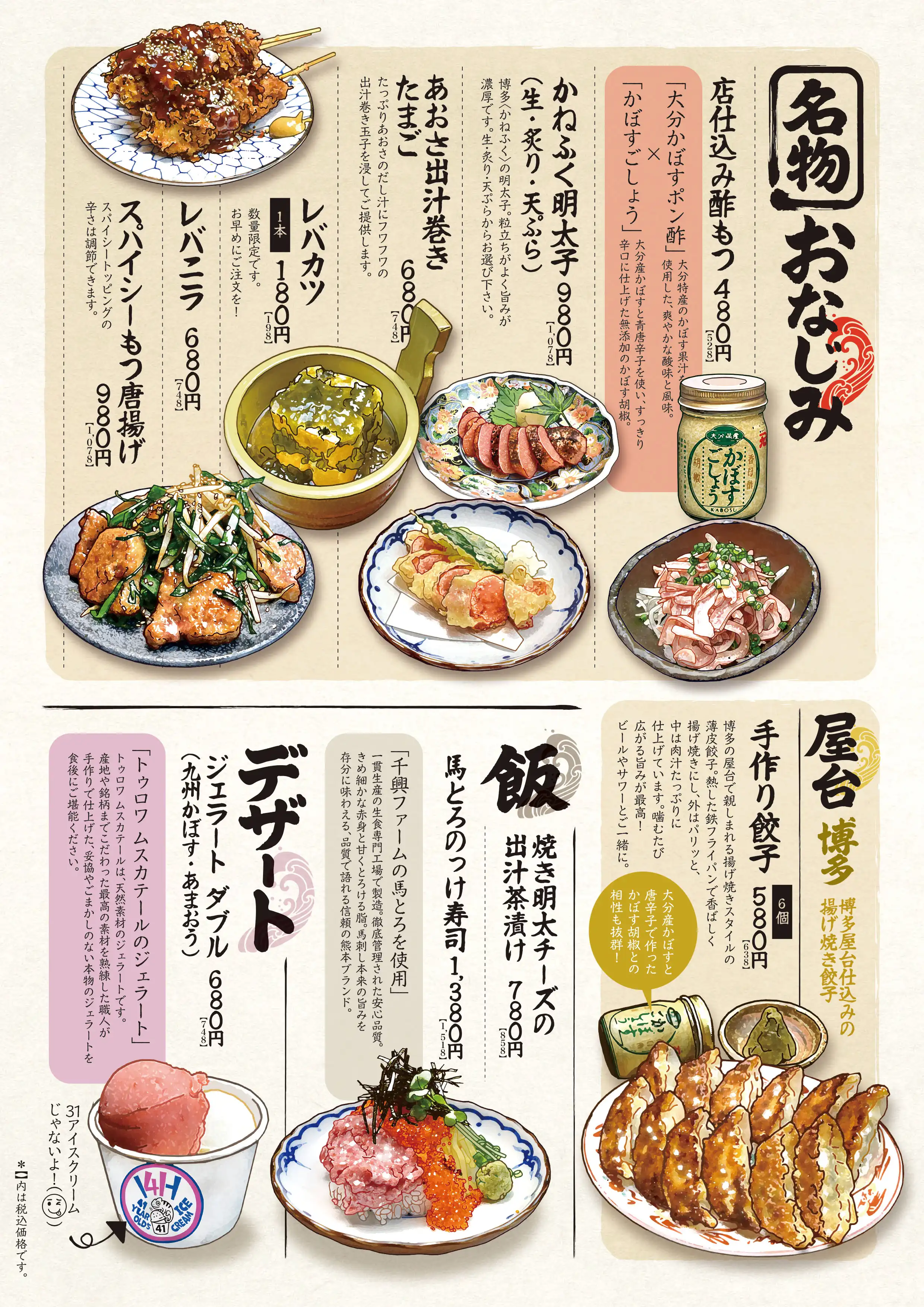 ・創業時からこだわる”もつ鍋専門店の味”×うまかもんの九州定番料理でお酒に合う!なんといっても”博多もつ鍋”は他では召し上がれない唯一無二のあじ。こちらが、お仕事帰りの飲み会・宴会にももちろん、12時から閉店までアイドルタイムなしでやってるので昼飲みもいつでも毎日利用できます。
